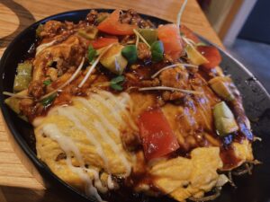 見た目のボリュームが凄くてカロリーが気になりますがなんと生地に小麦粉を使わず中身も山芋やビーフンそしてたっぷりのキャベツととてもヘルシーな構成になっております。