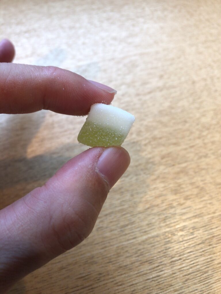 クリームの方がより柔らかい。噛み心地の違う2層のグミがいい感じ!