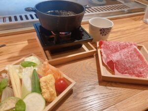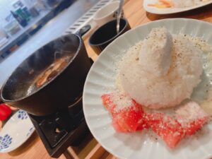 梅を使用したつけダレと割り下がいい感じで早々にお肉もお野菜も平らげていいお出汁が出たそこへ最後の締めにフレッシュトマトとチーズを投入っ!