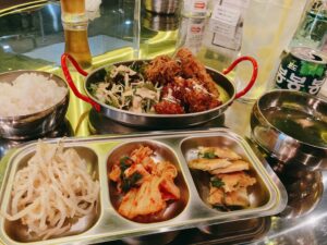 サクサクのフライドチキンとヤンニョムチキンを頂ける定食です。