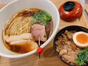 名古屋コーチンの旨味溢れるスープに2種の醤油を絶妙な割合でブレンドし低温調理した鴨肉のレアチャーシューを添えた名古屋コーチンの鴨醤油らぁ麺