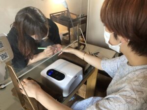 さっそく椅子に座ってネイルをして貰います。まず下準備として爪の形を整えたりファイルと呼ばれる器具で爪の表面を削りわざと傷をつけジェルネイルの乗りをよくする作業を行います。