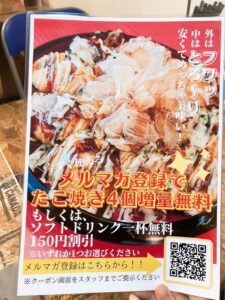 たこ焼き4個増量無料orソフトドリンク無料などのお得なプレゼント企画も行っています。