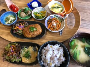 色とりどりの小鉢に様々なお料理が少しずつ。旅館の朝食のようでありながらハンバーグなどもあり和洋折衷なランチです。