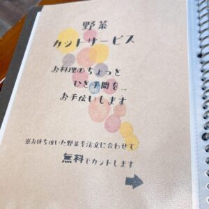 メニュー表に持ち込み野菜のカットサービスがあるのですがそれはそういった方達が働ける場を提供する事そしてお母さん達の家事の一手間を少しでも楽に出来たらというところから始まったようです。