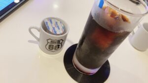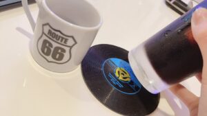 アイスコーヒーの下に引かれたコースターもレコード盤を模したものでそれだけでも気分が上がりますねぇ!!