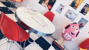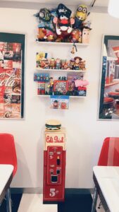 入店するとそこは、映画の中のようなレトロな雰囲気と共に数多くのアメリカンキャラクター達がお出迎えしてくれます^o^