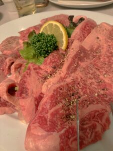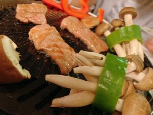 国産牛肉やジューシーな豚バラ肉がたくさん乗ったお皿と色とりどりな野菜が乗ったお皿そしてサラダボウルが運ばれてきました。