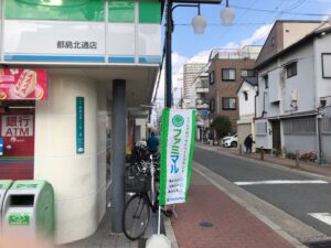 都島本通4西の交差点の左にファミマ、右手に青い看板のバレエスタジオがあり、バレエスタジオを右に入ってすぐ