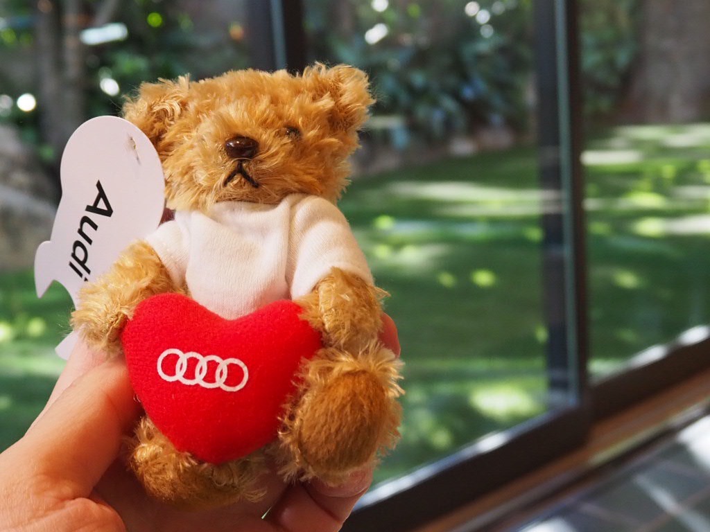 椅子の上にはアウディマーク入りのトートバックが。中には資料とドリンクと人形が!かわいい!