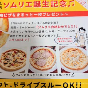 ディナータイム限定でソムリエデビューした髙田マネージャーに「ソムリエ合格おめでとう!」とお伝えするとピザが貰えるんですー!