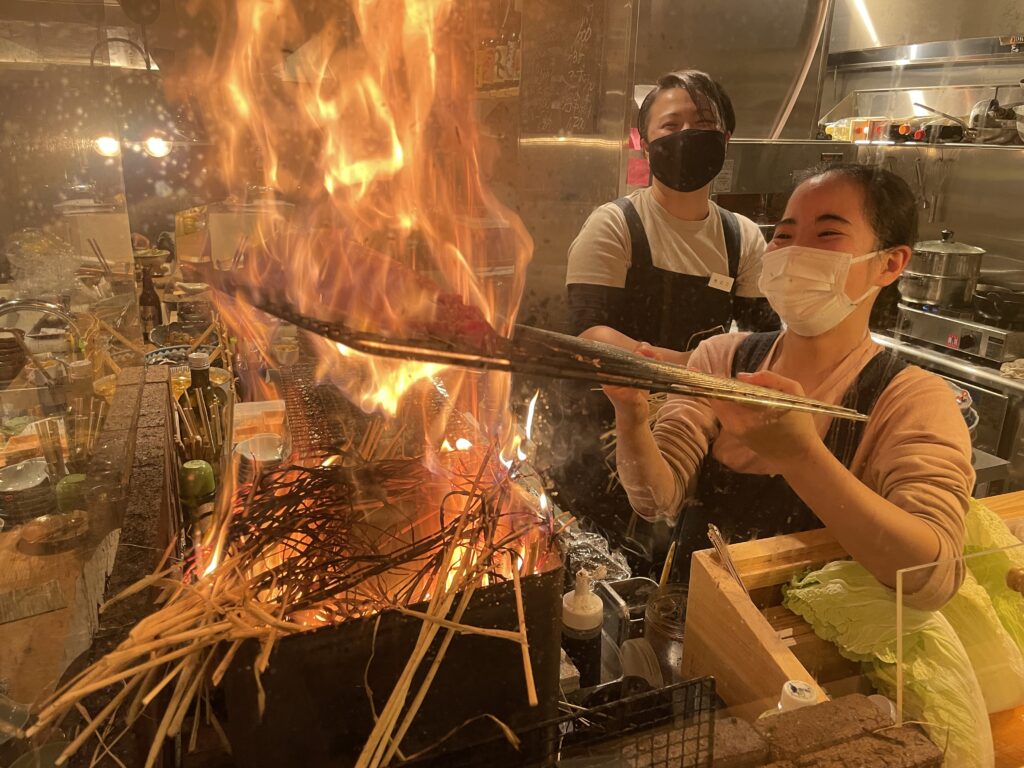 「かつおのわら焼きたたき」を頼んだら豪快に目の前で焼いてくれました。