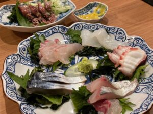 3種盛りを火切りに、お造り5種盛りやカキフライ、ホタルイカの酢味噌、レバーパテ、華さんの名物、牛巻きを頂きました!