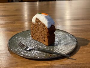 キャロットケーキは、米粉を使っておりグルテンフリーなので身体にも優しいらしくしっとりしていて食べやすいと編集長。