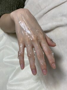 ジェルを拭き取った手は少し白くツルツルになっているようです。