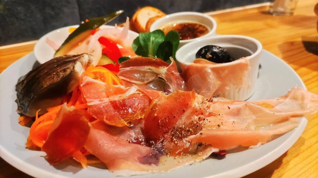 さてお料理はまずは前菜盛り合わせ(1,500円)「生ハム 季節の野菜のピクルス アンチョビポテトサラダ レバーペーストのキャラ キャロットサラダ オリーブのマリネ」がワンプレートで盛り付けされボリューム満点、ワインのあてに最高です!