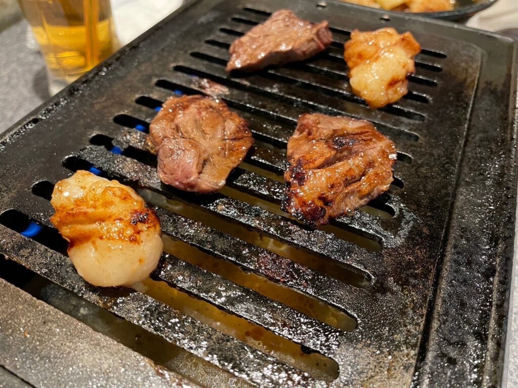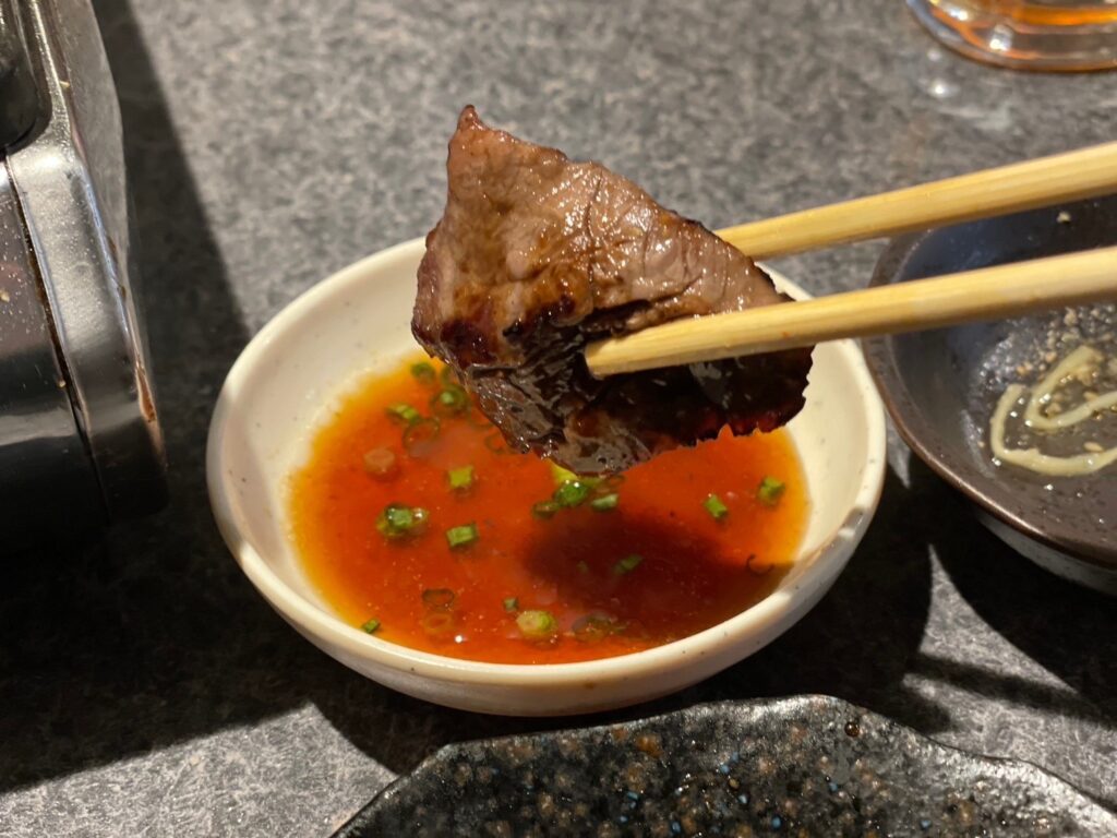 好きな焼き具合になったら、タレにつけて食す😋