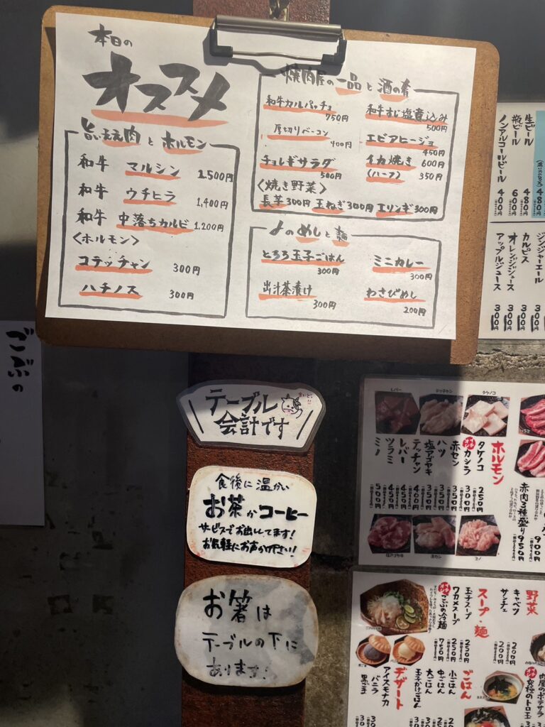 立喰焼肉と言いつつ、店内には椅子完備で立喰席はありません。