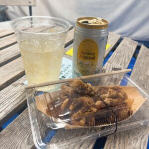 まずは屋台を回ってみました!京橋のいろんなお店が出店していて、どれも美味しそうで迷いましたが、まずは黒ダレ唐揚げを食べてみました。香ばしいタレがしっかり染み込んだジューシーな唐揚げを楽しむことができました☺️ハイボールも一緒に飲んで、夏の夜には最高の組み合わせです🍻