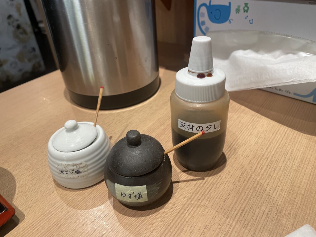 天つゆの他にゆず塩や天こじ塩も置いてありますので、お塩で食べるのもありです✨