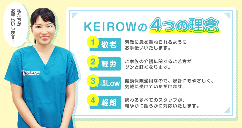 KEiROWさんの4つの理念!ご利用者様、ご家族の皆様に愛される、地域に密着した訪問マッサージをご提供し、安心・快適な生活を送れるお手伝いをするということですね。