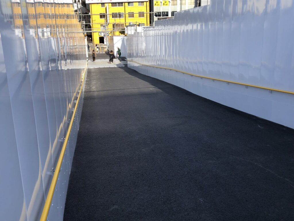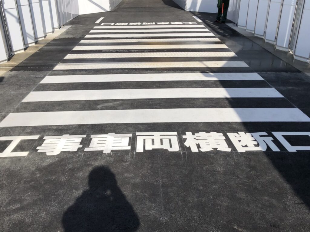 迂回路をご利用くださいの文字。で左を見たら工事現場の中を道ができてます!